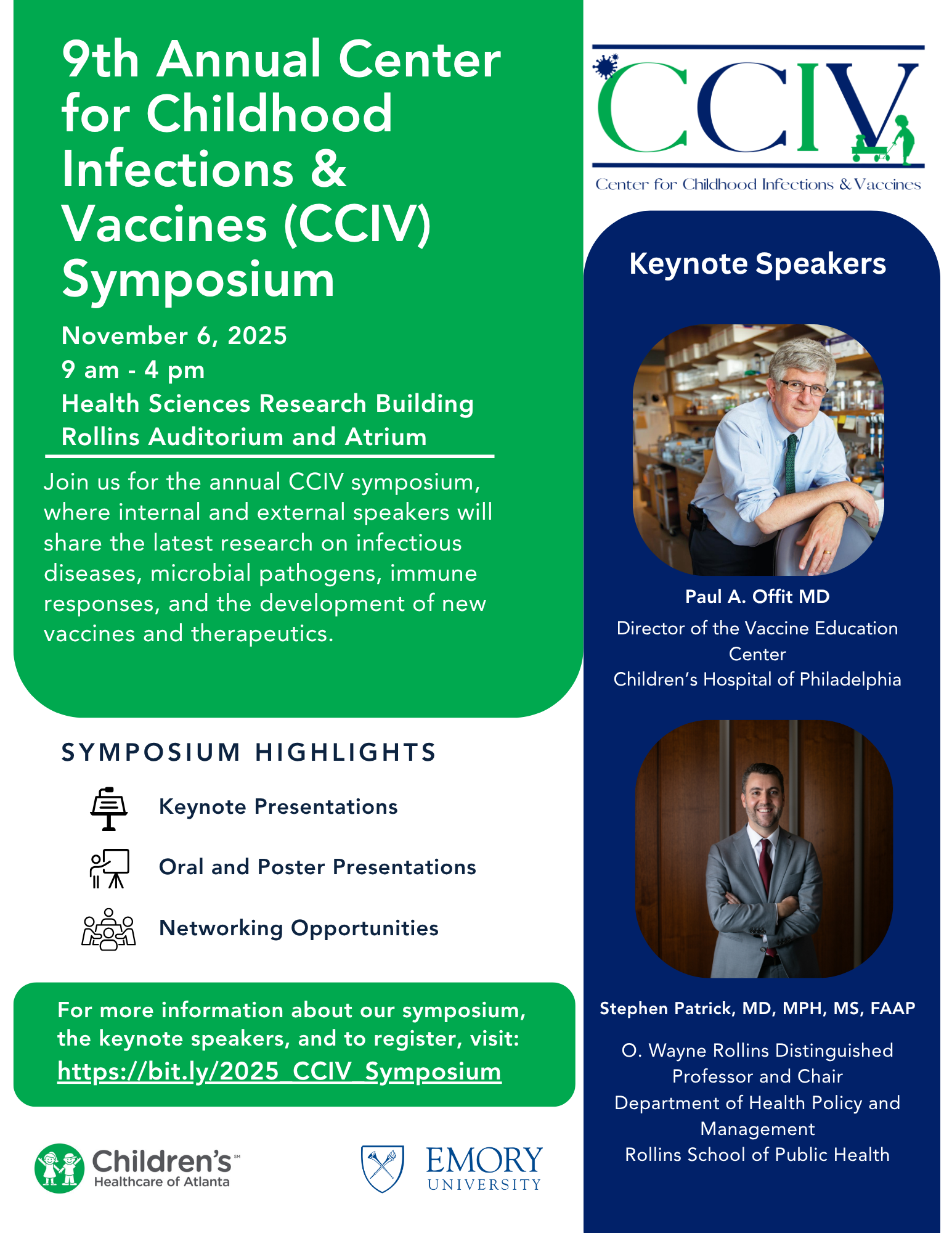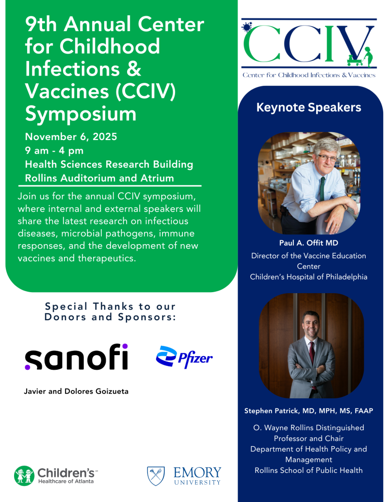 | 9:00 – 9:15 AM | Welcome and Opening Remarks | Rollins Auditorium | Mehul Suthar, PhD Director, CCIV Associate Professor, Emory University School of Medicine |