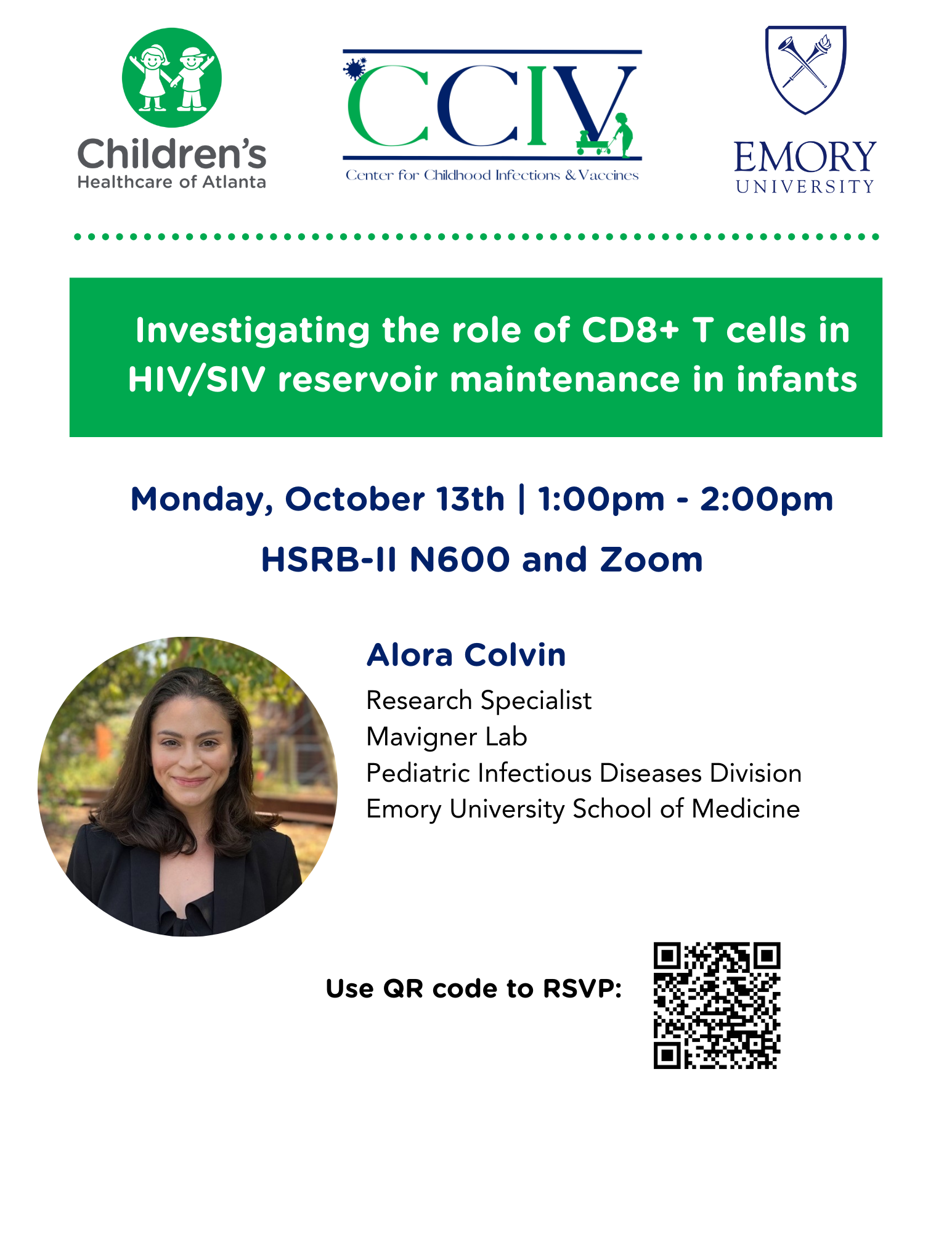 Alora Colvin is a research specialist in Dr Mavigner’s lab in the pediatric infectious diseases division. She earned her bachelor’s in microbiology from the University of Georgia where her research focused on the symbiosis between the alphaproteobacterium, Wolbachia pipientis, and its host nematode, B. malayi. After graduating she worked for 2 years as an ORISE fellow at the CDC where she used molecular biology and genetics methods to develop quality assurance materials to aid and assist state and international newborn screening labs. At Emory, she is conducting HIV reservoir studies using the nonhuman primate model to investigate immunological barriers to cure for children living with HIV.