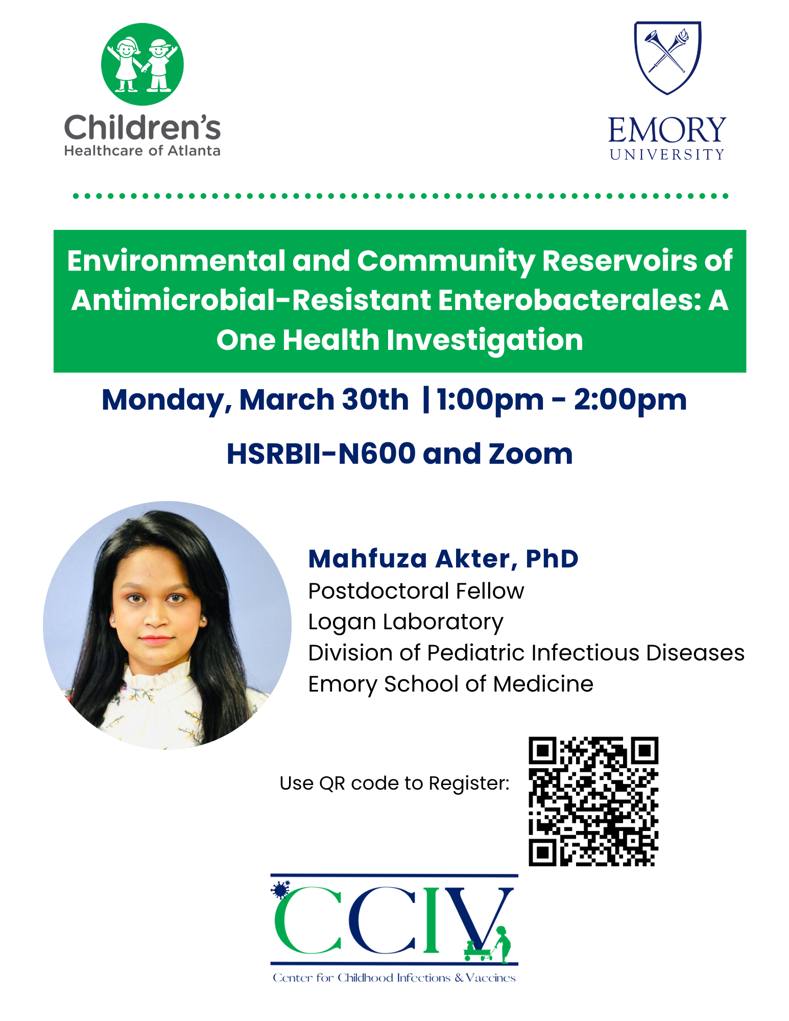 Mahfuza Akter, PhD, is a Postdoctoral Fellow in the Department of Pediatrics, Division of Pediatric Infectious Diseases at the Emory University School of Medicine, working under the supervision of Dr. Latania K. Logan. Her research focuses on the environmental transmission and evolution of antimicrobial-resistant bacteria, in particular multidrug-resistant Enterobacterales, and their impact on community and public health.
