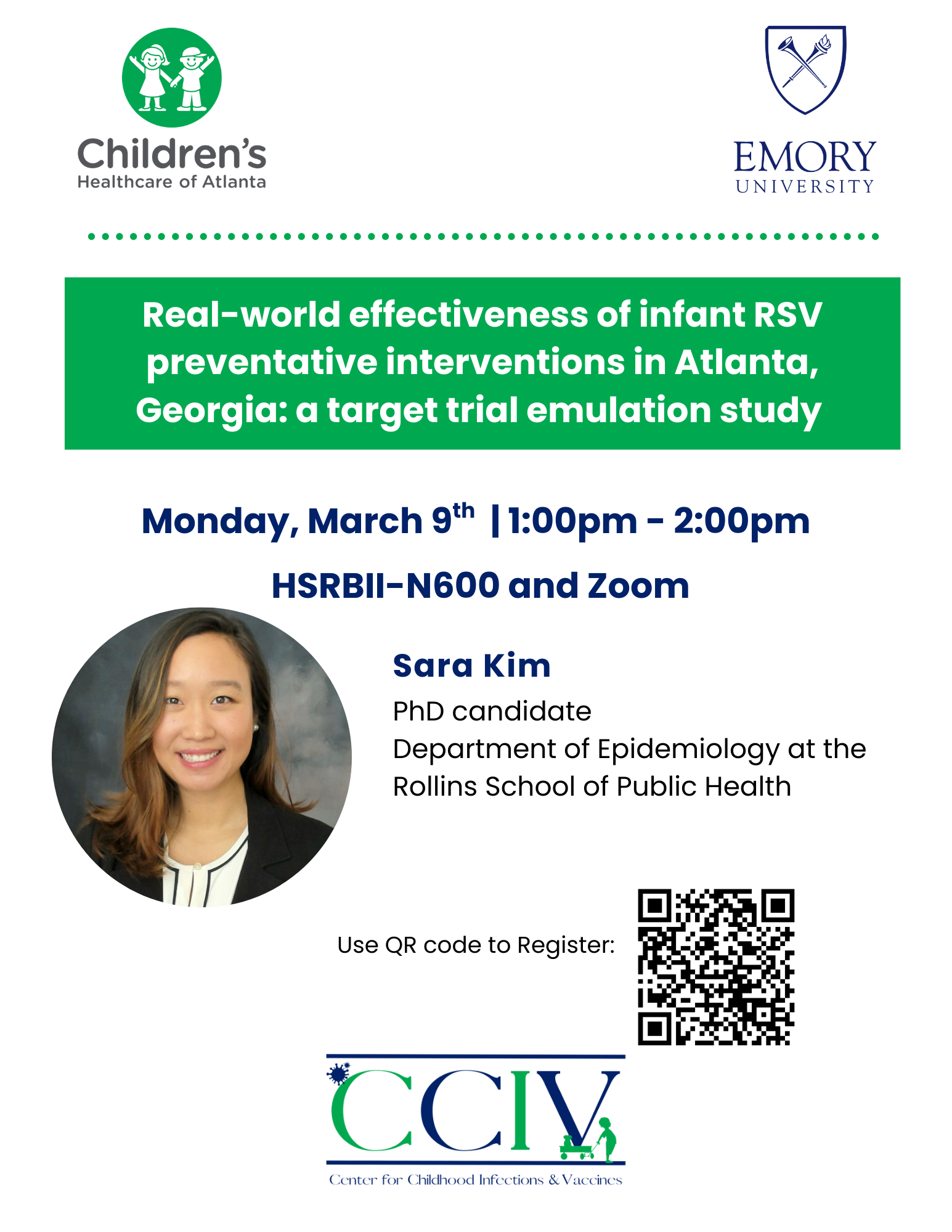 Sara Kim is a PhD candidate with the Department of Epidemiology at the Rollins School of Public Health. Her research focuses on improving vaccine effectiveness estimation and infectious disease forecasting using advanced machine learning and causal inference methods. She is a T32 Fellow with the Emory Vaccine Data Science Training Program and Georgia ARCS scholar.