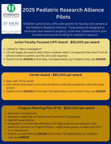 Faculty from GRA-affiliated institutions are permitted to apply, provided the applications include an investigator from Emory DOP or Children’s Healthcare of Atlanta.